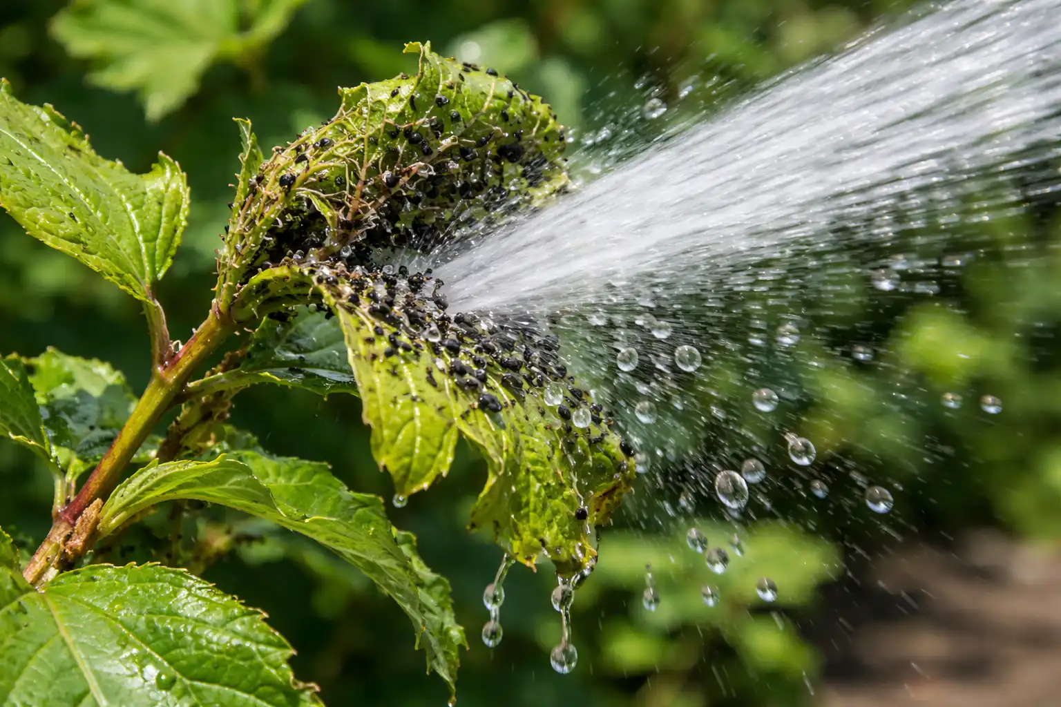 První věc, kterou udělám mechanické odstranění mšice. Pokud je hmyzu málo, můžete ho jednoduše smýt silným proudem vody z hadice. To je třeba provádět opatrně, aby nedošlo k poškození mladých výhonků. Účinný je také ruční sběr mšic v rukavicích.