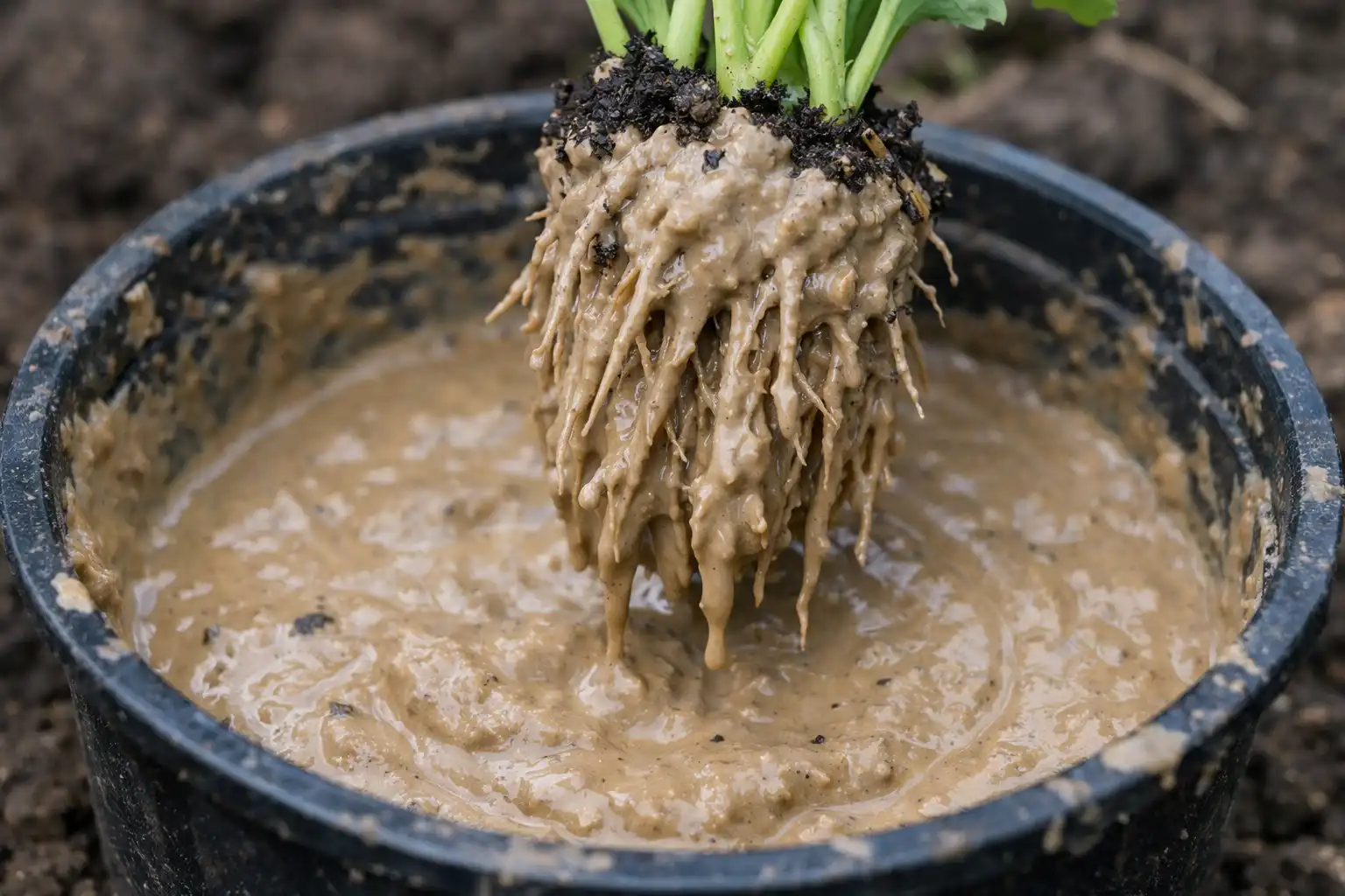 Hlínu a vodu jednoduše smíchejte do konzistence husté zakysané smetany. Pokud máte humus, přidejte ho do směsi. Do směsi ponořte kořeny jednotlivých sazenic a dbejte na to, aby je hlína rovnoměrně pokryla. Tato stránka hliněná krusta chrání kořeny před vysycháním a zajišťuje těsný kontakt s půdou, což je pro kořeny klíčové. zakořenění a další růst.
