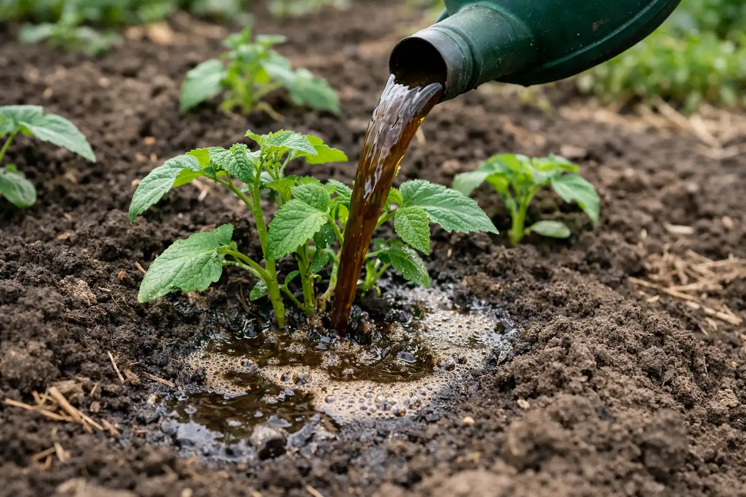 Pravidelné zalévání zeleninové zahrady na jaře hnojivovou infuzí výrazně zvyšuje šance na bohatou úrodu.
