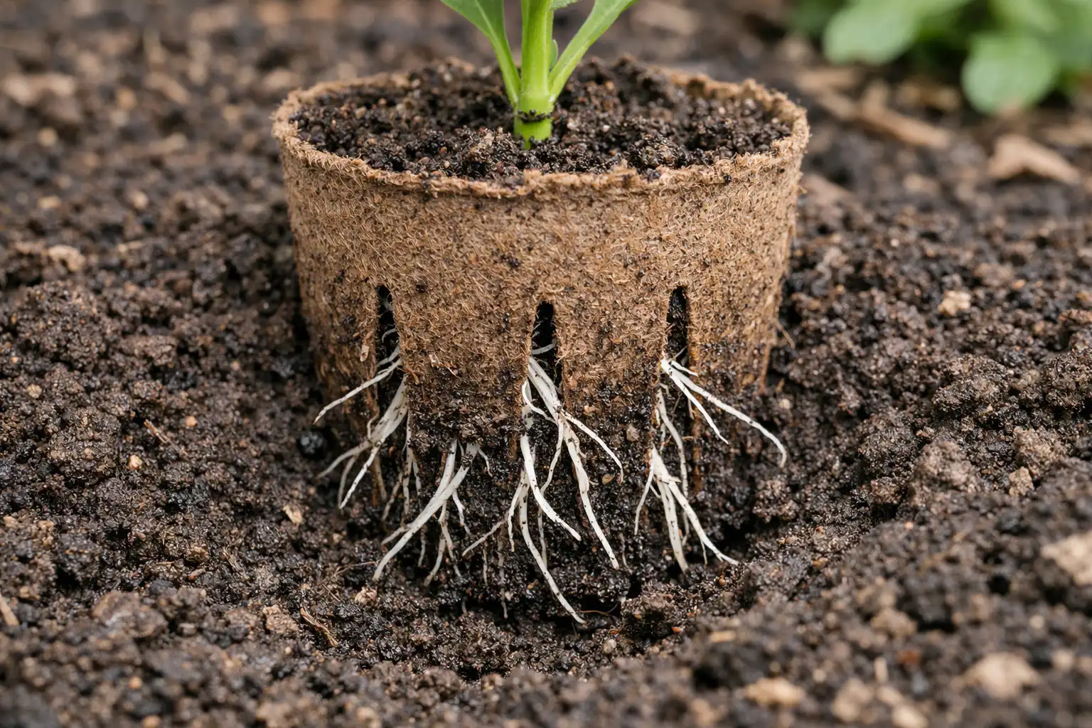 Hlavní výhodou použití stlačené rašeliny je, že není potřeba žádné stres při přesazování. Rostlina si jednoduše nevšimne, že byla „přemístěna“, protože její kořeny prorůstají stěnami nádoby přímo do půdy na záhonu.