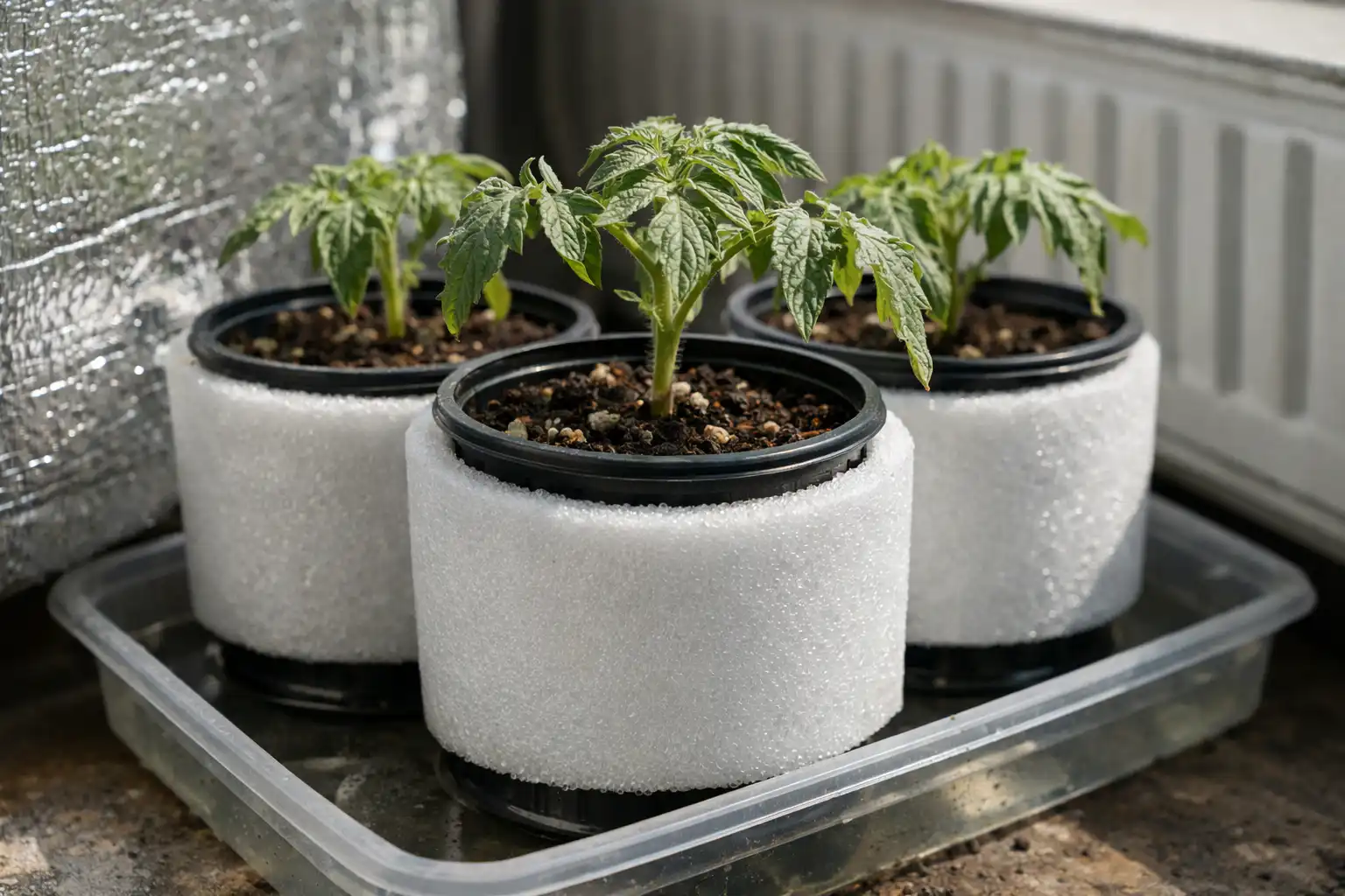 Použijte reflexní obrazovky z obyčejné fólie k odvádění nadměrného tepla z nádob se sazenicemi.