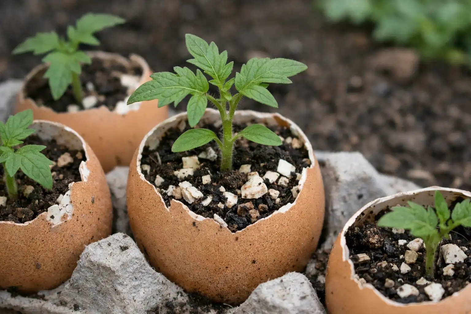 Vaječné skořápky jsou tvořeny téměř z 95 % uhličitanu vápenatéhokterý je pro rajčata nezbytný v období aktivního růstu. Bez něj mohou vrcholky rostlin zčernat a plody onemocnět. vrcholová hniloba. Obsahuje také hořčík, fosfor a křemík, díky nimž je stonek silný a odolný proti větru.