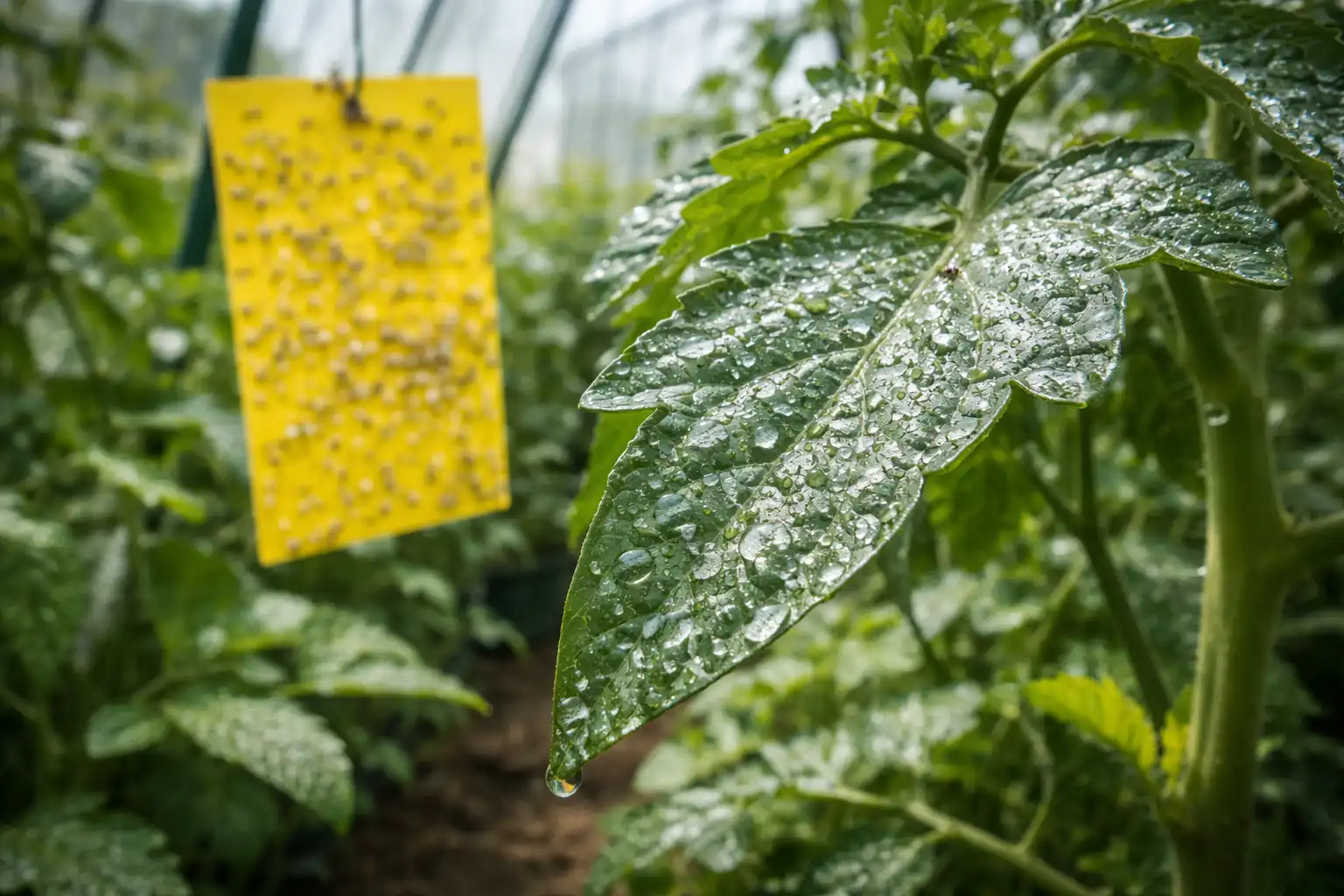 Instalace žlutých lepicí pasti v blízkosti rostlin. Barva přitahuje dospělce a ti se přilepí na povrch.