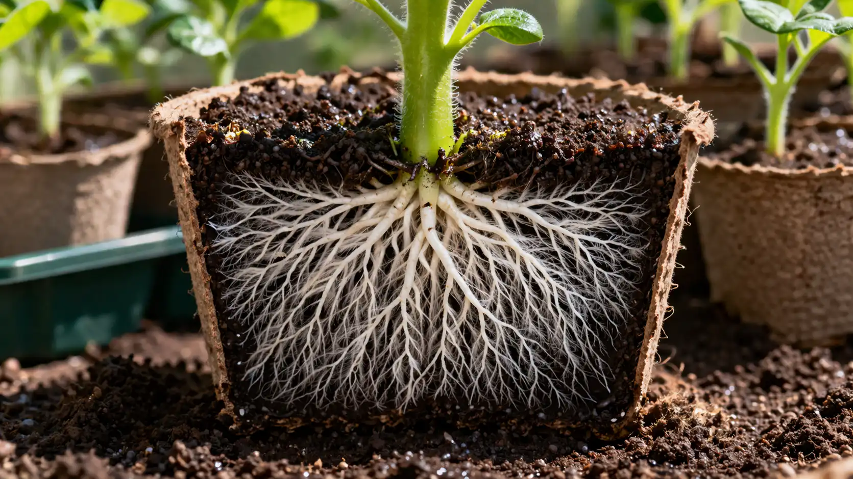Stimulace kořenového systému. Kořeny v balu rostou dvakrát rychleji a vyplňují celý objem poháru.