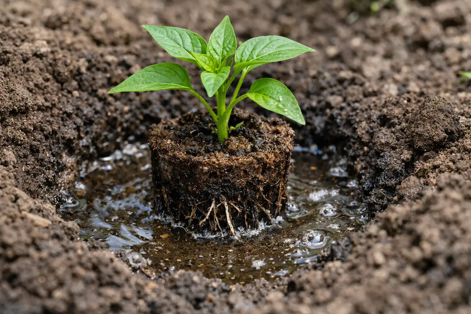 Běžné zalévání jamky často nestačí. Papriky vyžadují hluboké zavlažování, aby kořeny směřovaly dolů a nezůstávaly na povrchu, kde půda rychle vysychá.