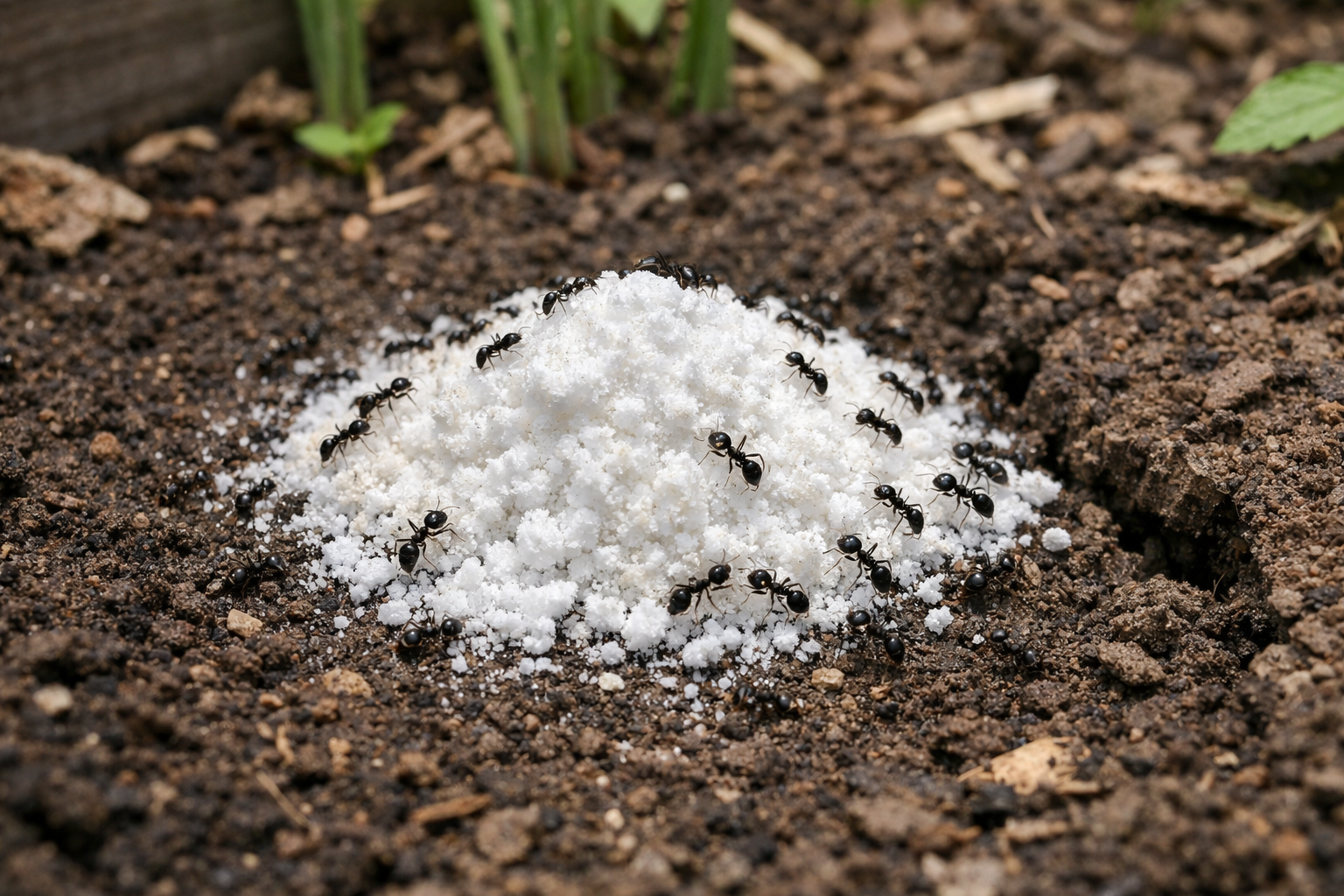 – Ohřejte vodu na vlažnou (ne vařící). – Rozpusťte dvě polévkové lžíce jedlé sody na dva litry vody. – Roztok nalijte přímo do středu mraveniště. – Posypte suchou jedlou sodou a přikryjte tmavou fólií na 24 hodin.