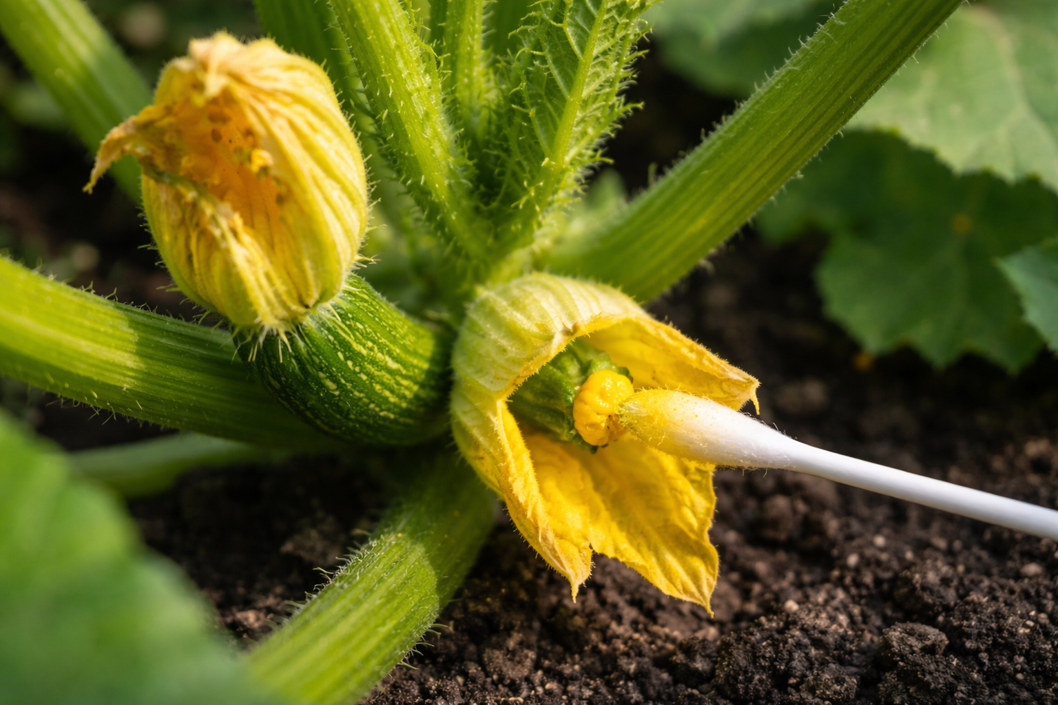 Utrhněte samčí květ, opatrně odstraňte okvětní lístky a tyčinkou se dotkněte středu samičího květu (u báze má malou kopii cukety).