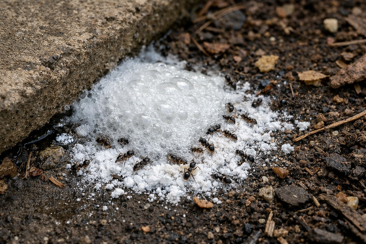 Pokud najdete velké hnízdo v otevřeném terénu, můžete použít silnou reakci Neutralizace. Nejprve naplňte otvory jedlou sodou a poté je vyplňte octem. Vzniklá pěna pronikne do nejhlubších kanálků mraveniště a pokryje místa, kam se běžný prášek nedostane.