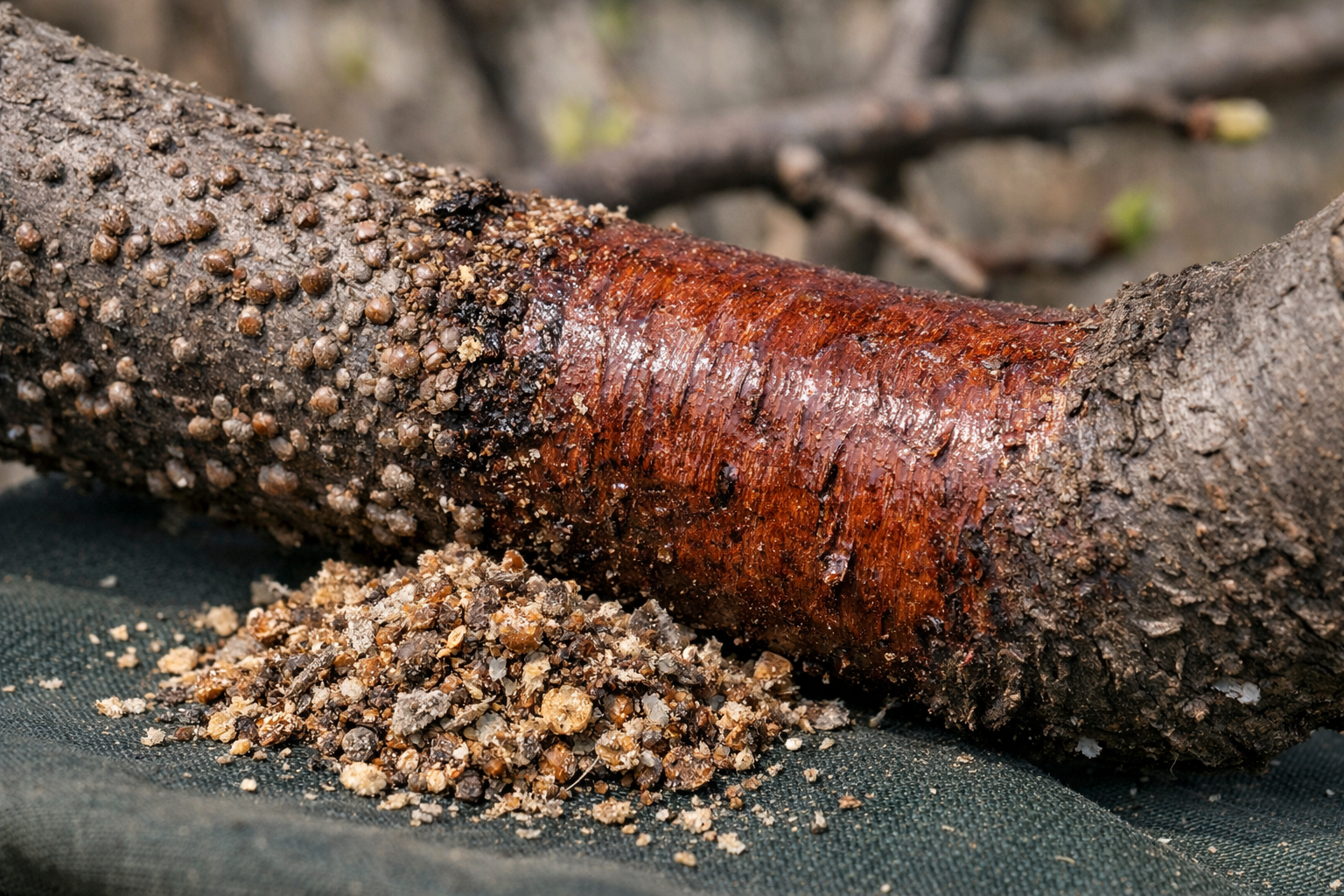 Schránka je suchá, snadno se oddělí od kůry nehtem a pod ní se nenachází žádná živá tkáň ani mokrá stopa.