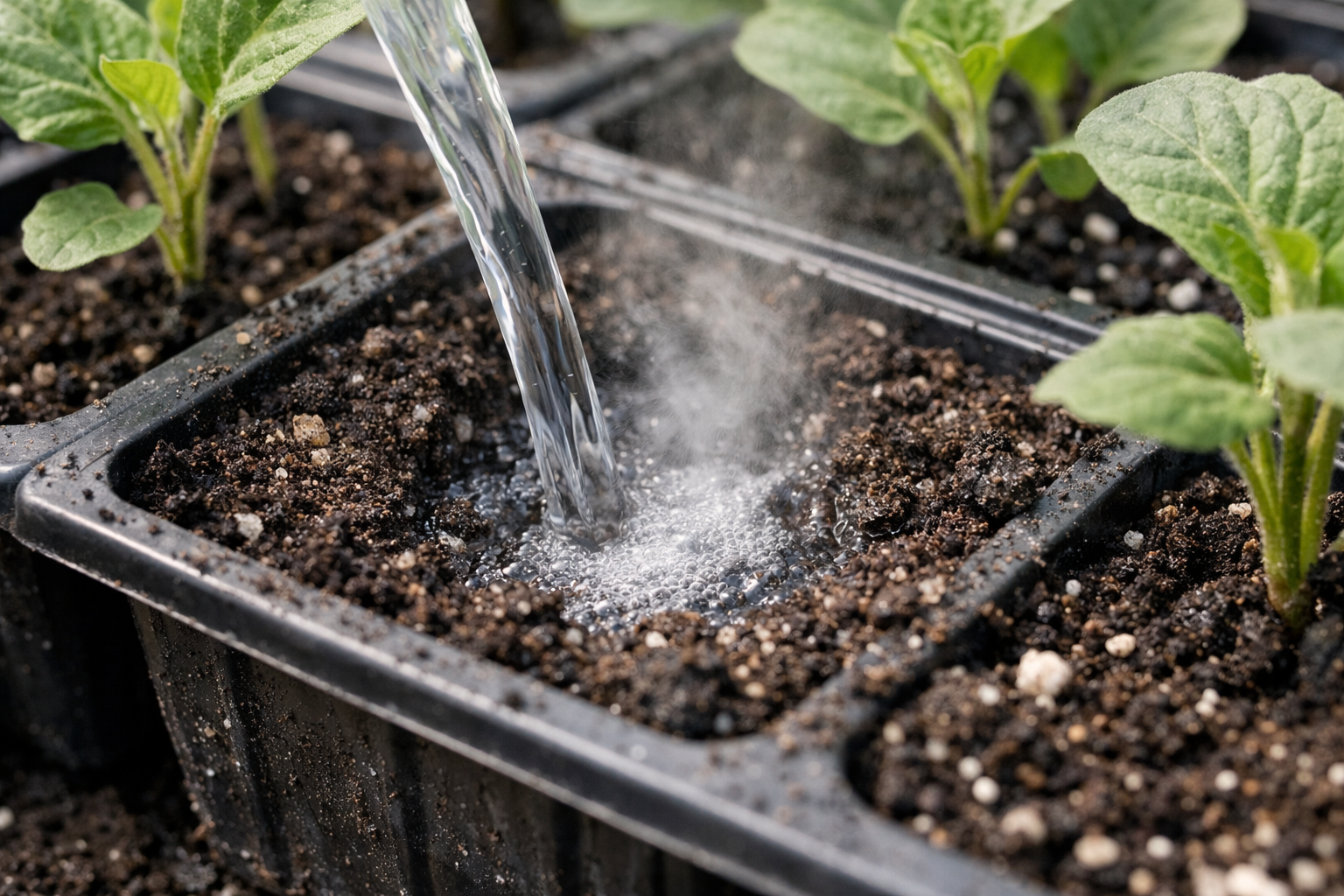 – Používejte pouze měkkou vodu. – Nedovolte, aby kapky kapaly na kotyledony. – Dřevěnou tyčinkou zkontrolujte hloubku vyschnutí půdy. – Vyhněte se stagnující vodě v zásobníku.