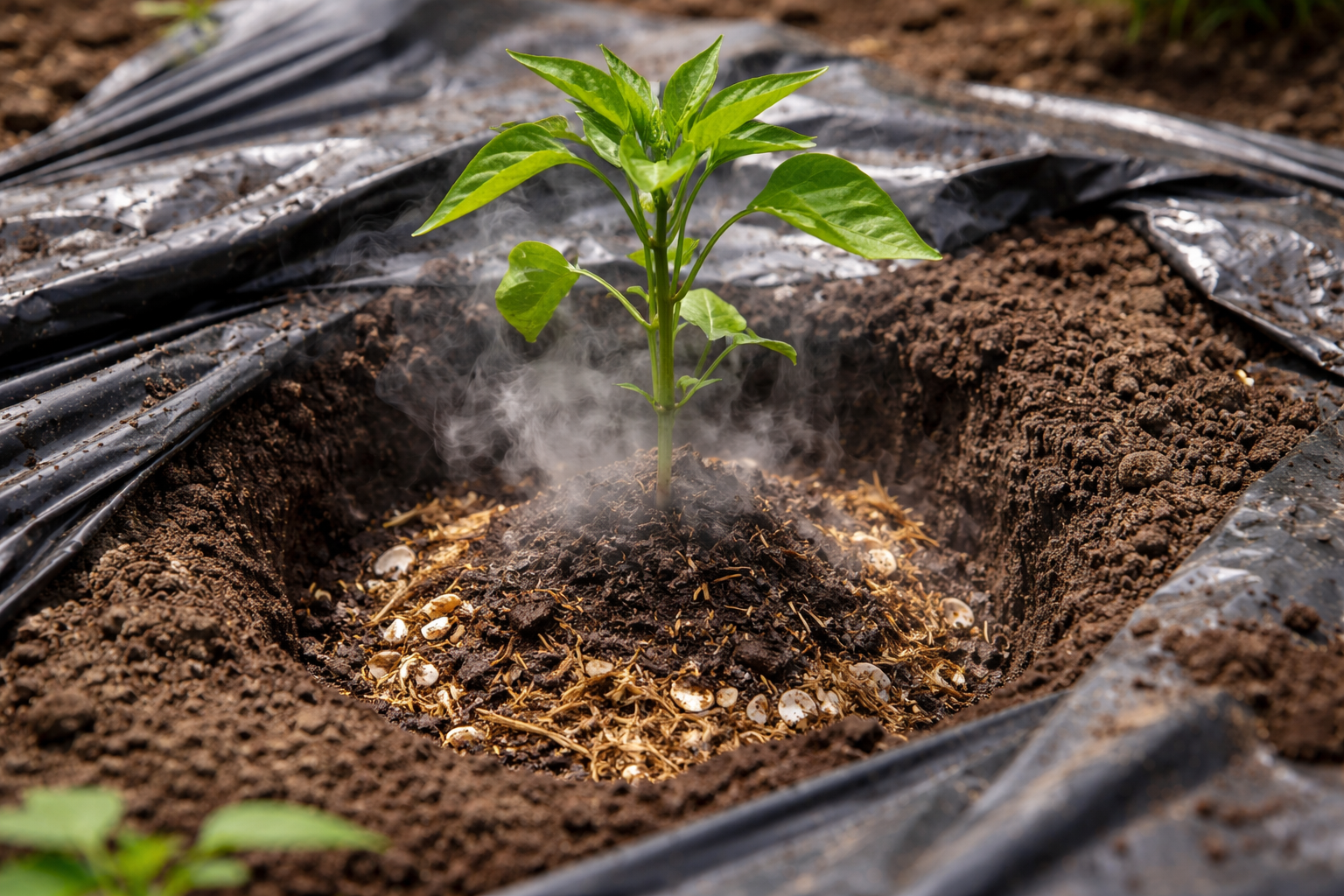 Pro rychlé zahřátí lůžka používám metodu „horké díry“ a černé mulčovací fólie. To vám umožní vysadit sazenice o 10 dní dříve než obvykle.