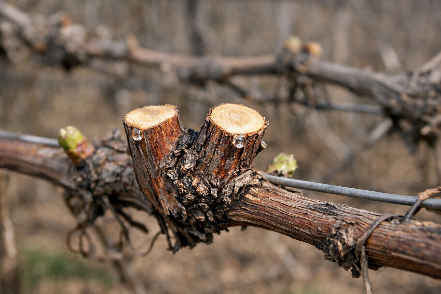 Hlavní zásadou, kterou jsem se za léta naučil, je, že hrozny plodí na révě aktuálního roku, která vyrostla z révy dvouletého dřeva. Proto bezohledně odstraňujeme staré větve a ponecháváme pouze základnu a čerstvé výhony.