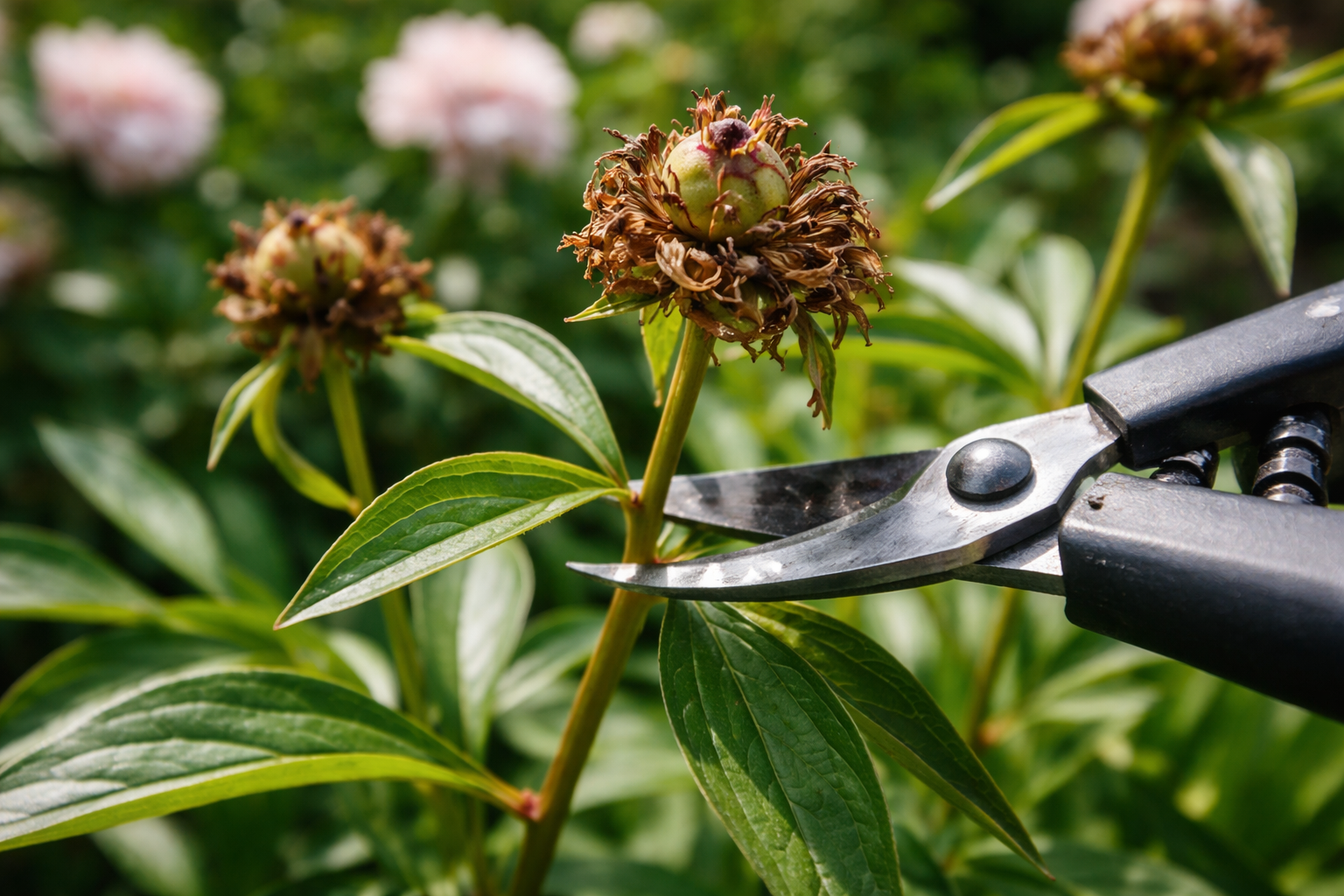 Když okvětní lístky opadají, rostlina začne tvořit tobolky se semeny. Jedná se o energeticky nejnáročnější proces v životě pivoňky. Pokud je neodstřihnete, keř spotřebuje všechny živiny na semena, která pravděpodobně nepotřebujete. Výsledkem bude, že příští rok získáte malá poupata nebo prázdnou zeleň.