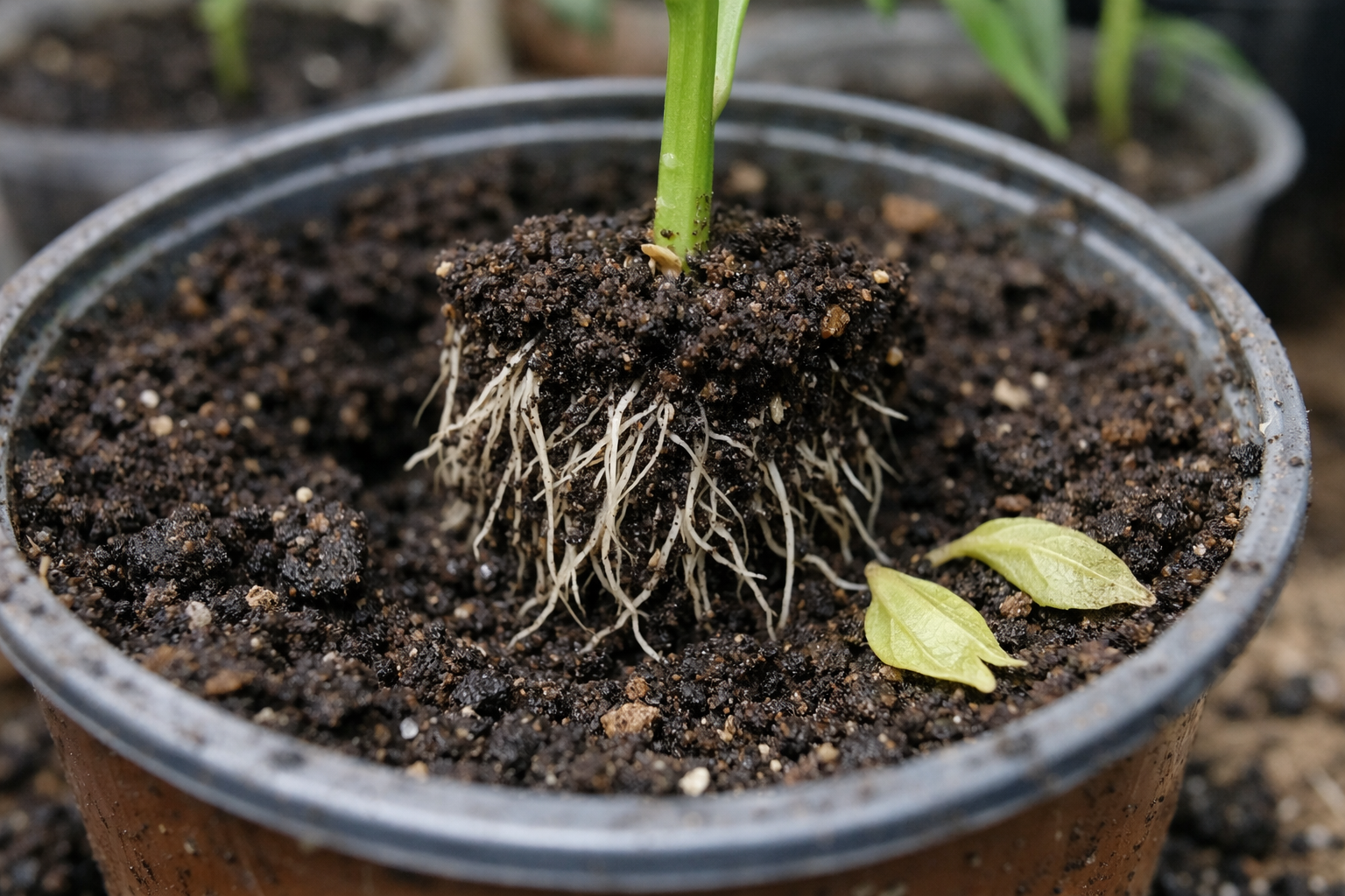 Papriky mají na rozdíl od rajčat velmi citlivý kořenový systém. Jakékoli mikropoškození nutí rostlinu k přežití. Aby ušetřila vláhu a energii pro regeneraci kořenů, zbavuje se sazenice „balastu navíc“ – listů.