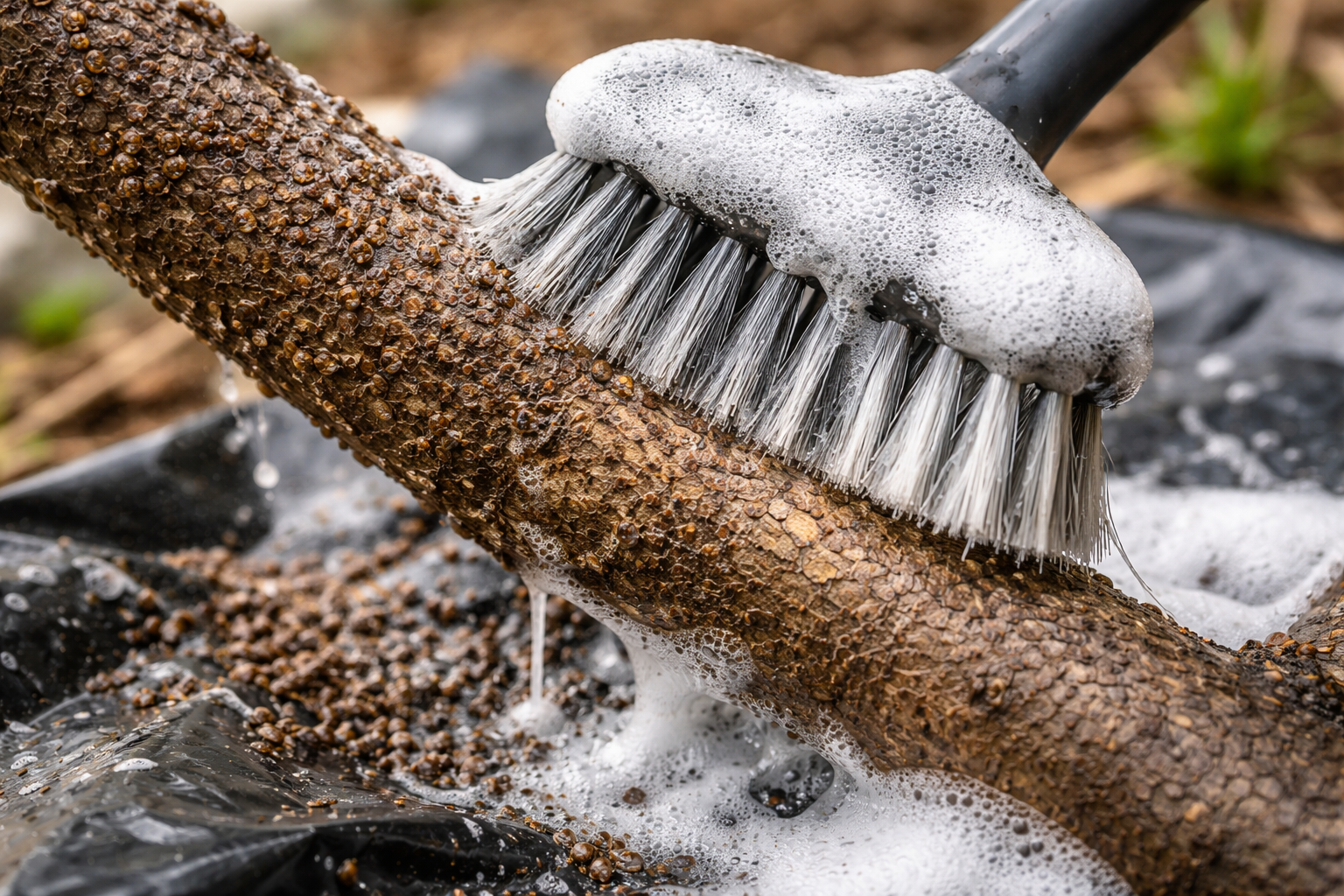 Hlavní tajemství účinnosti spočívá v předběžném ošetření kůry hustou pěnou dehtového mýdla, která změkčí krunýře škůdců před čištěním.